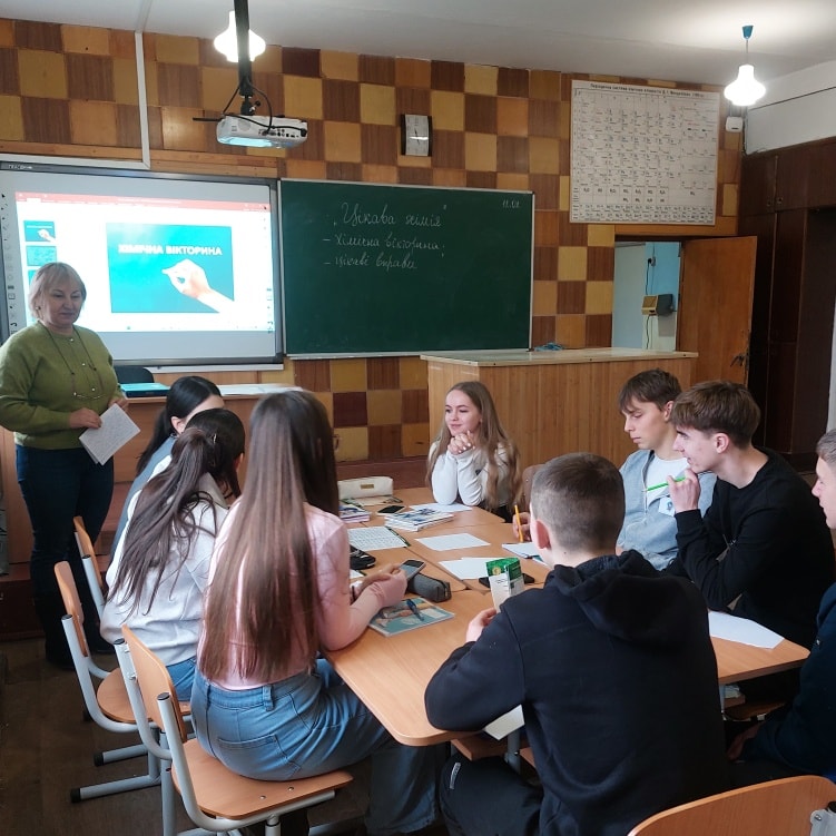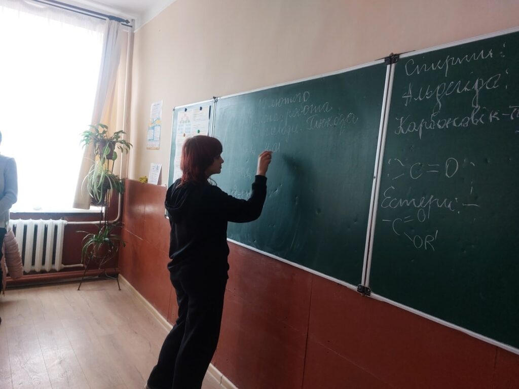 Окремою частиною заходу стало бліц-опитування, під час якого учні відповідали на короткі, динамічні запитання. Вони стосувалися не лише хімії, а й зв’язків хімії з іншими науками: біологією, фізикою, географією, медициною та екологією. Старшокласники пояснювали, як хімічні процеси відбуваються в організмі людини, яку роль відіграють речовини у побуті та промисловості, чому знання хімії важливе для розуміння явищ навколишнього світу та сучасних технологій.