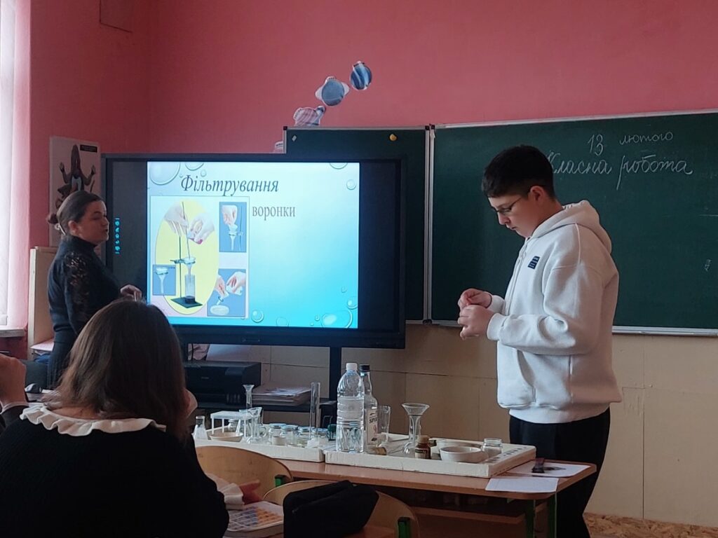 Особливо захопливою стала практична частина уроку: учні спостерігали за дослідами та виконували завдання, під час яких мали змогу власноруч застосувати різні способи розділення сумішей. Це викликало щире зацікавлення, багато запитань і активне обговорення побаченого.