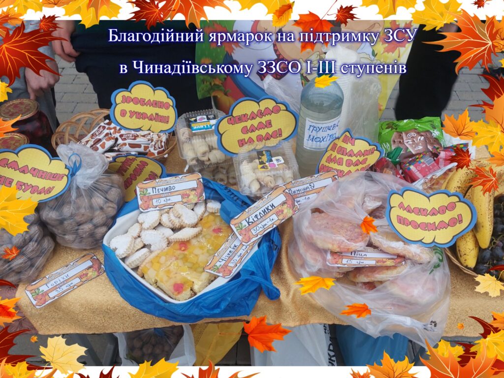 24 жовтня в Чинадіївському ЗЗСО І-ІІІ ступенів відбувся благодійний ярмарок на підтримку ЗСУ. Для продажу приготували різноманітні смаколики: тістечка, горіхи, компоти, соки, пряники, цукерки та сувеніри. Захід пройшов весело та яскраво на подвір’ї закладу. Кожен клас, який брав участь у ярмарку, намагався зібрати якомога більше коштів для підтримки наших захисників. По завершенню ярмарку було зібрані 26 230 гривень, які будуть передані на потреби ЗСУ. Дякуємо за активність та підтримку усім батькам, які із задоволенням та натхненням постійно долучаються до благодійного ярмарку. Спасибі діткам, які продавали й купляли. Спасибі класним керівникам за організацію та за збір коштів. Памꞌятайте, кожна ваша гривня – це чиєсь врятоване життя!
