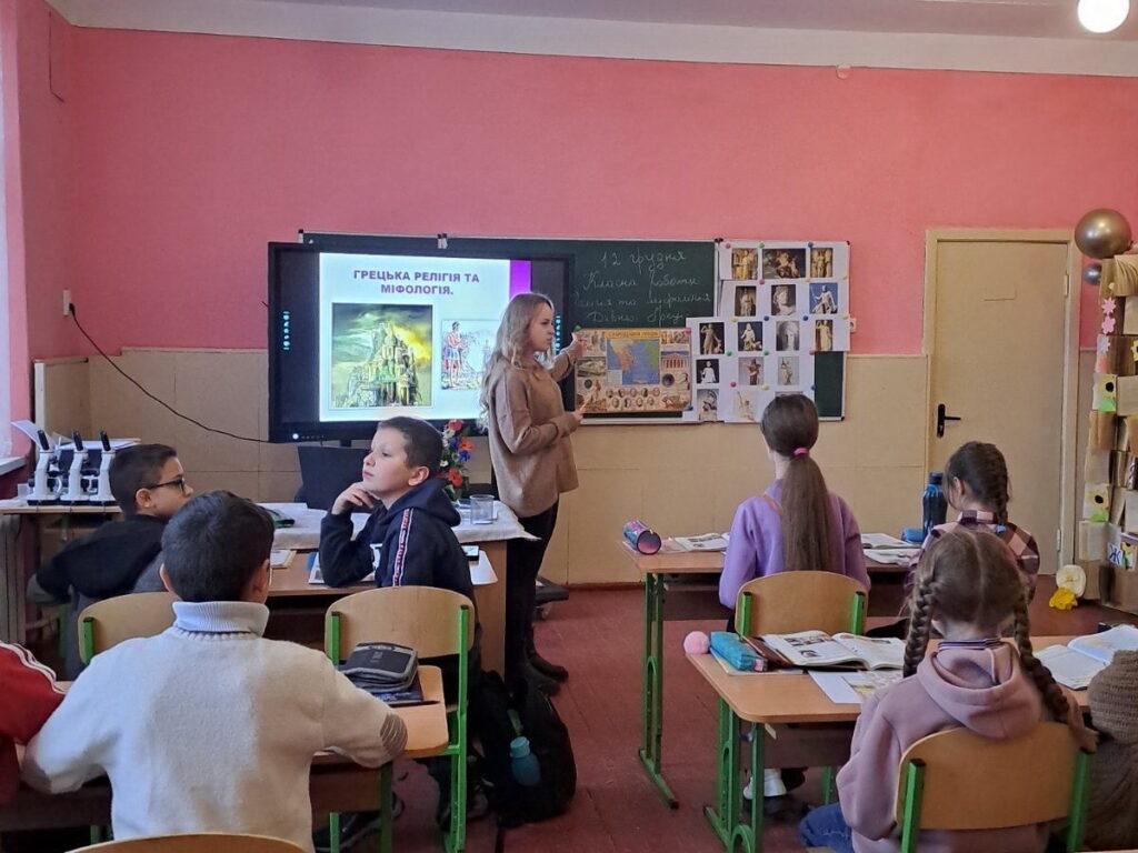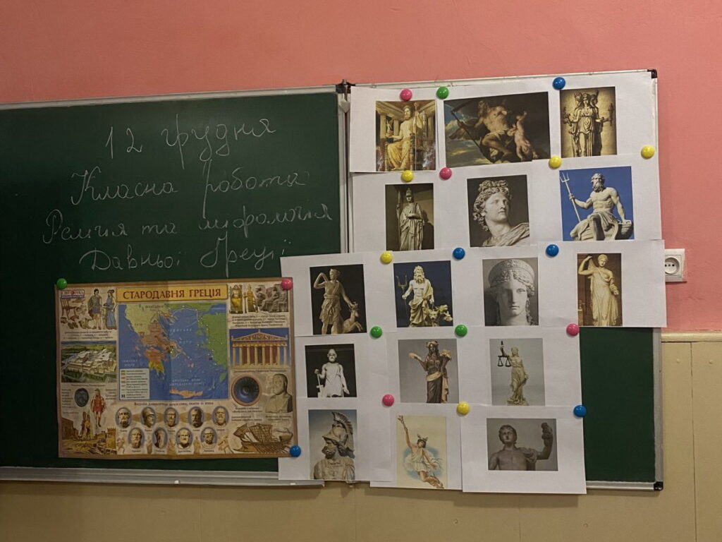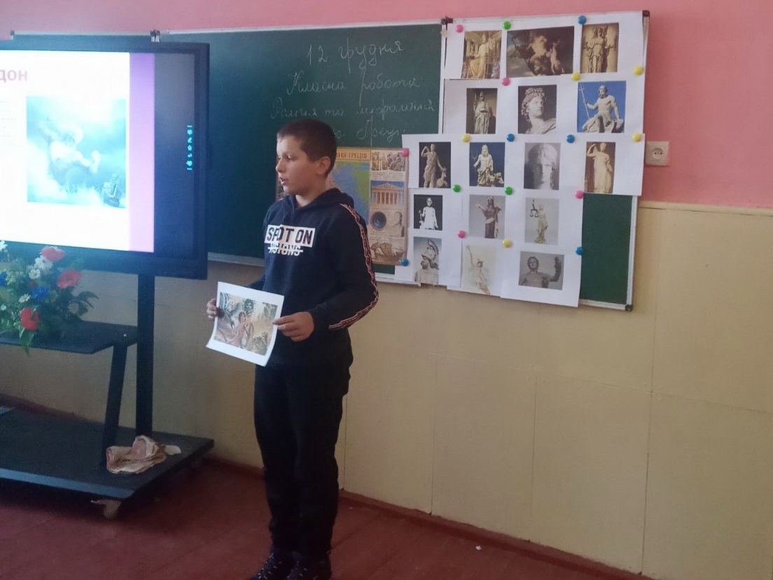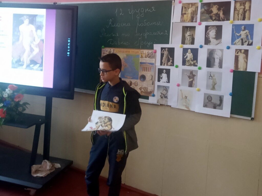 Цікавою частиною уроку було те, що учні, отримавши від вчителя випереджувальні завдання, познайомили всіх присутніх на уроці з міфологією Давньої Греції, а саме, розповіли про подвиги Геракла, безстрашного Персея, мужнього Прометея та відважного Тесея.
