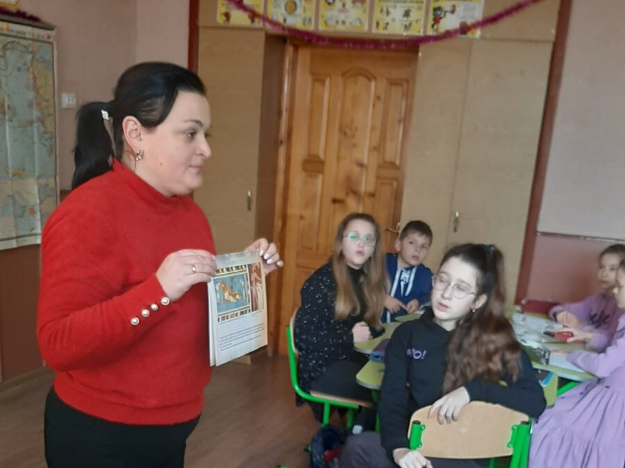 На уроці учні розглядали Крито-Мікенські палацові цивілізації та міфи про Троянську війну. Активно працювали в групах. Переказували давньогрецькі міфи про героїв. Вчитель Мигович Ольга Іванівна розповіла дітям про те, як археологи Артур Еванс і Генріх Шліманн відкрили ці цивілізації. Заняття було дуже жвавим і цікавим, учні продемонстрували свої знання, набуті на попередніх заняттях і навчилися висловлювати міркування про місце ахейської цивілізації в історії Греції
